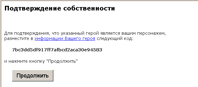 Если ник или id персонажа указаны верно, то загрузится страница "Подтверждение собственности", в противном случае будет выведена надпись о том, что персонаж в игре не найден.